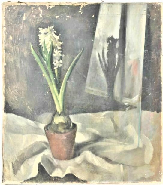 NEUE SACHLICHKEIT STILLEBEN Hyazinthentopf vor Glas spiegelnd [Fensterbild] Berlin nach 1933 Alexander Kanoldt attr. Verso Keilrahmen Stempel : Otto Ebeling BERLIN W. Kurfürsten Str. 120-21 Mal- u. Zeichenbedarf eberbachHELMlindach